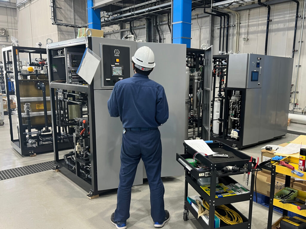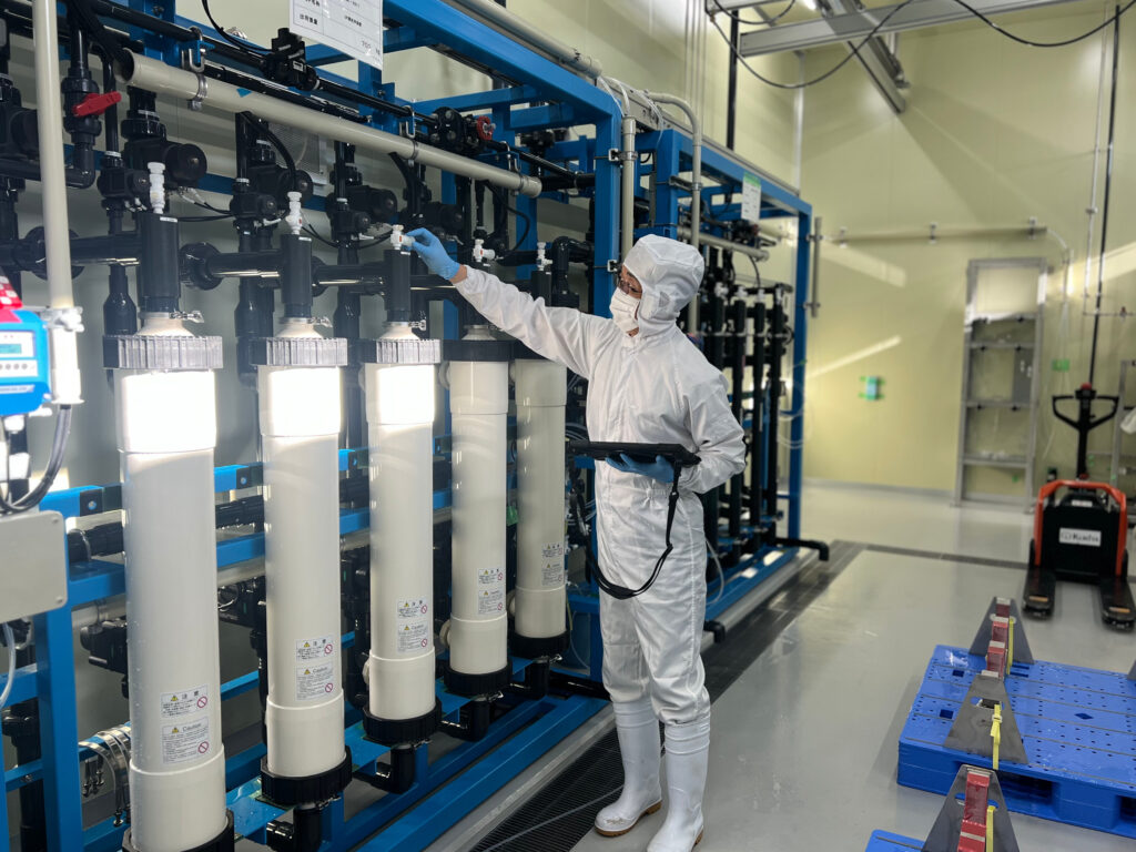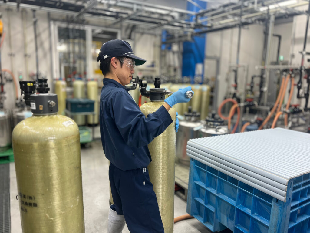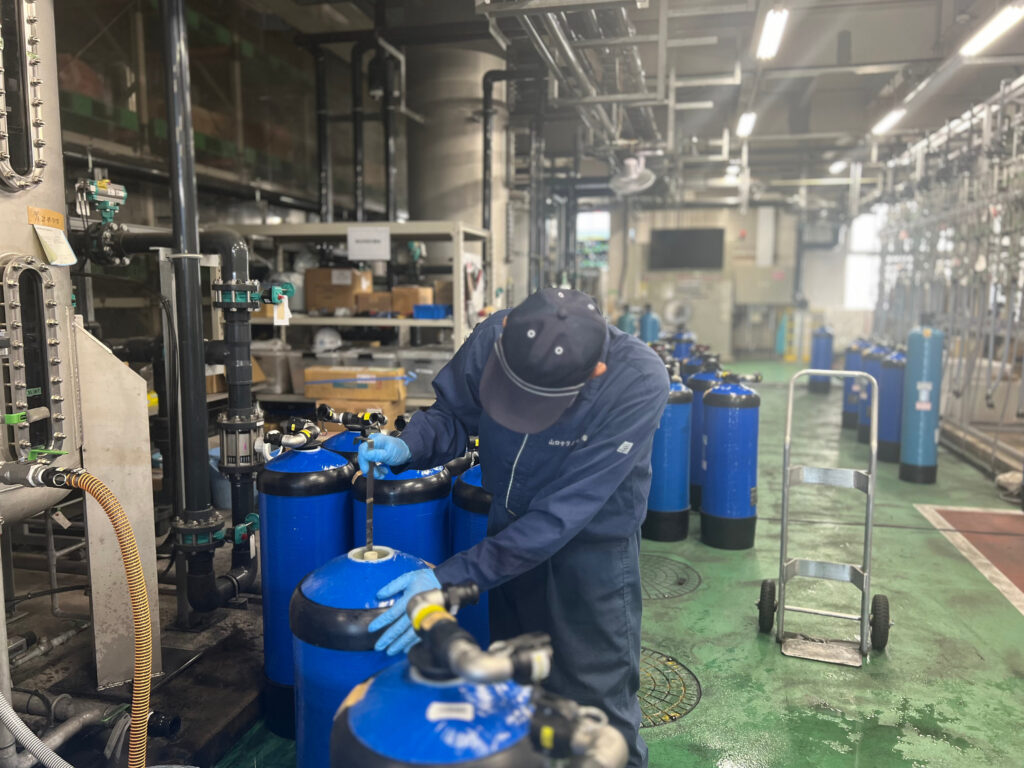イオン交換樹脂は、水中に含まれるイオン成分を吸着し、保持していたH⁺およびO²⁻を放出することで、水分子(H₂O)を生成します。当社では、イオン交換樹脂の精製・再生・混合・個別梱包に加え、イオン交換樹脂を充填したカートリッジ式純水器の整備業務にも携わっております。